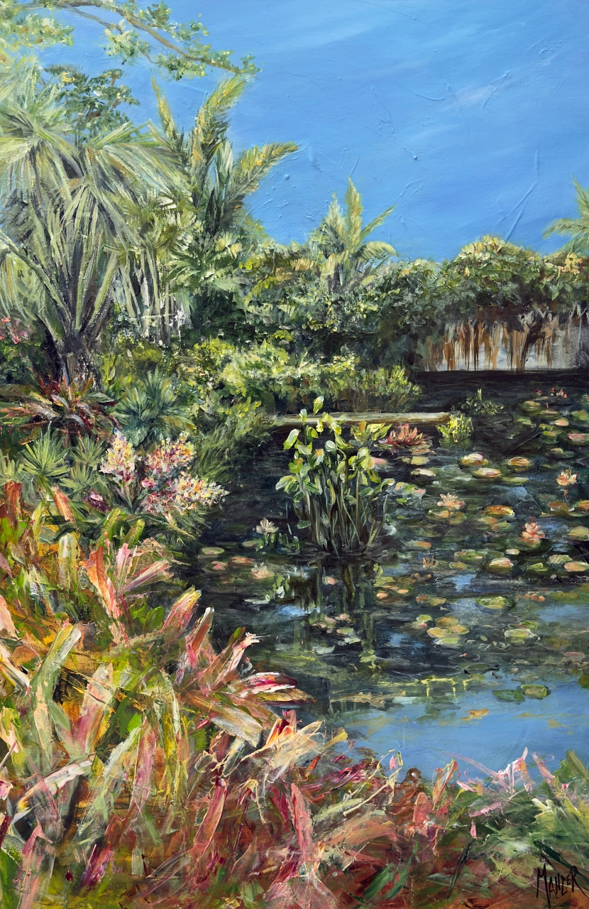A Day in Brazil captures a vibrant garden scene with fresh immediacy and textured energy. At its center, a small pond hosts water lilies in full bloom, their rounded leaves and petals layering natural detail across the surface. Surrounding foliage bursts with life, grounding the composition in warmth and variety. Palm trees and tall greenery frame the background, merging smoothly with a bright blue sky that suggests sunlit openness. Bold, dynamic brushstrokes give the scene a tactile rhythm, conveying the richness and movement of this lush outdoor space with clarity and an inviting desire to stay and enjoy.