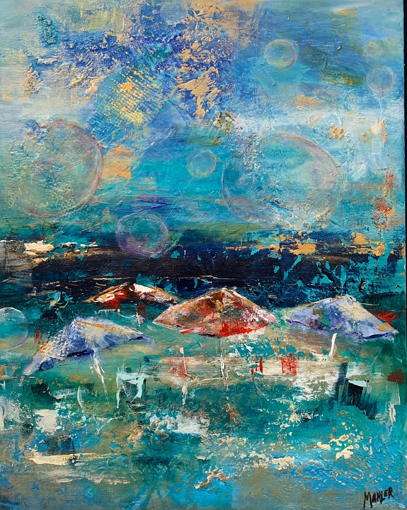 Beach Visitors presents an abstract seascape charged with energy and movement. Four Umbrellas dominate the foreground, their bold red, white, and purple hues layered with textured brushstrokes draw the viewer in. Abstract fun on the beach. The floating bubbles add a whimsical airy feeling and captivating a celebration of sorts. This is a great idea for a birthday or gift to someone special for any occasion.