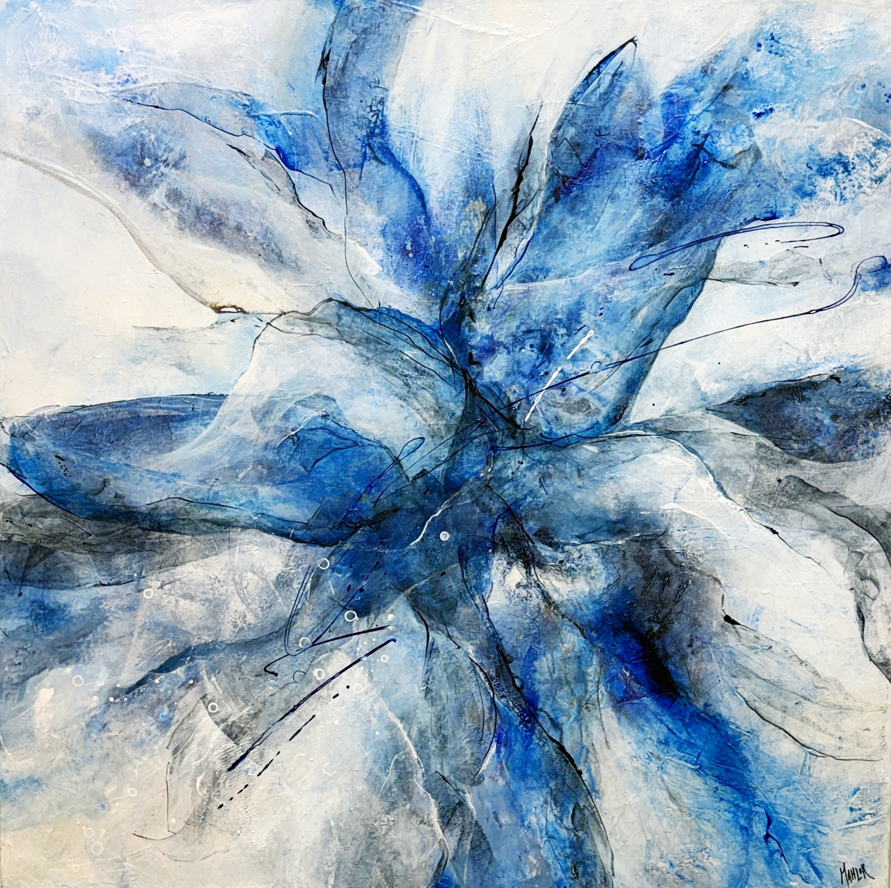 Chasing the Blues captures a floral form through fluid abstraction and a limited palette of blues and white. The composition is painted with broad overlapping petals that seem to float outward, their edges softly blending toward the center. Thin, intricate lines weave through the petals, creating a subtle sense of movement and depth. Small white accents punctuate the surface, lending a quiet energy the the piece. The result is an artwork that feels both alive and serene inviting a moment of focused calm while evoking the delicate unfolding of a flower in bloom. Original made of acrylic and Mixed Media