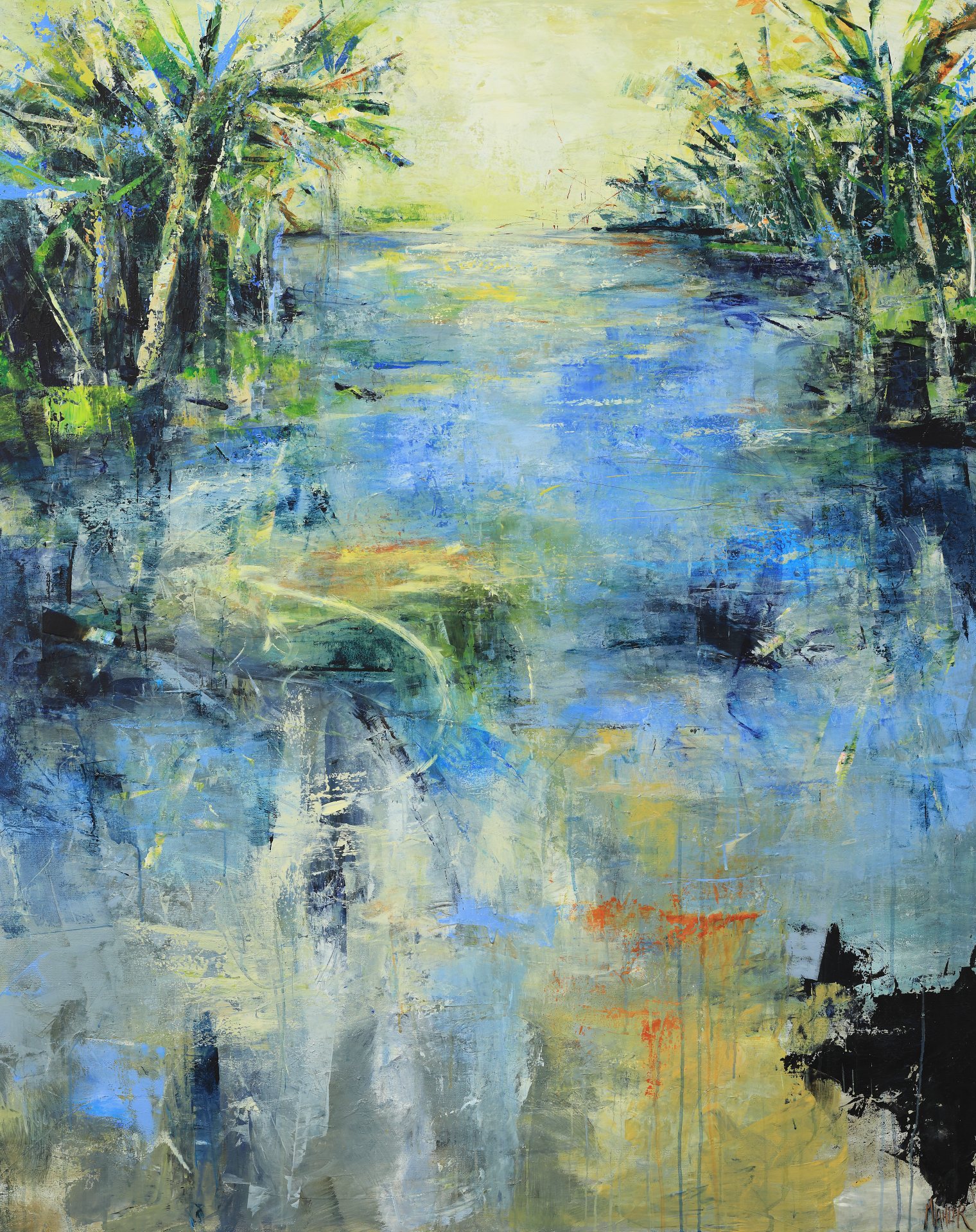 This piece captures a calm yet vibrant coastal scene drenched in warm, natural light. The composition centers on a reflective body of water that extends gently toward a luminous horizon. Bold, confident strokes shape clusters of palm trees on either side, their deep greens and dark accents grounding the view with a sense of place. The sky’s soft yellows and creamy tones suggest the quiet transition of dawn or dusk, lending a peaceful, contemplative mood. Texture and color interplay thoughtfully throughout, inviting a tactile experience that echoes the layered rhythms of nature.