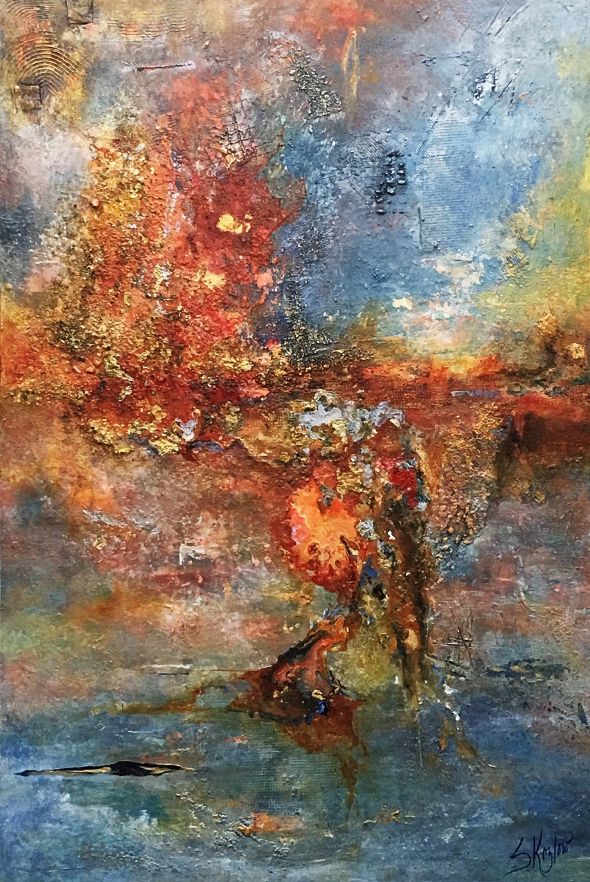 Dynamic presents a bold contrast between warm and cool hues, where intense reds, oranges, and golds flow into expansive areas of blues and greens. The surface is richly textured with layered, impasto strokes that give the composition a tangible depth. The forms move organically across the canvas, evoking natural elements like fire and water merging or geological shifts unfolding. This interplay of color and texture creates a visual rhythm that feels both energetic and grounded, inviting close observation while maintaining a strong sense of atmosphere.