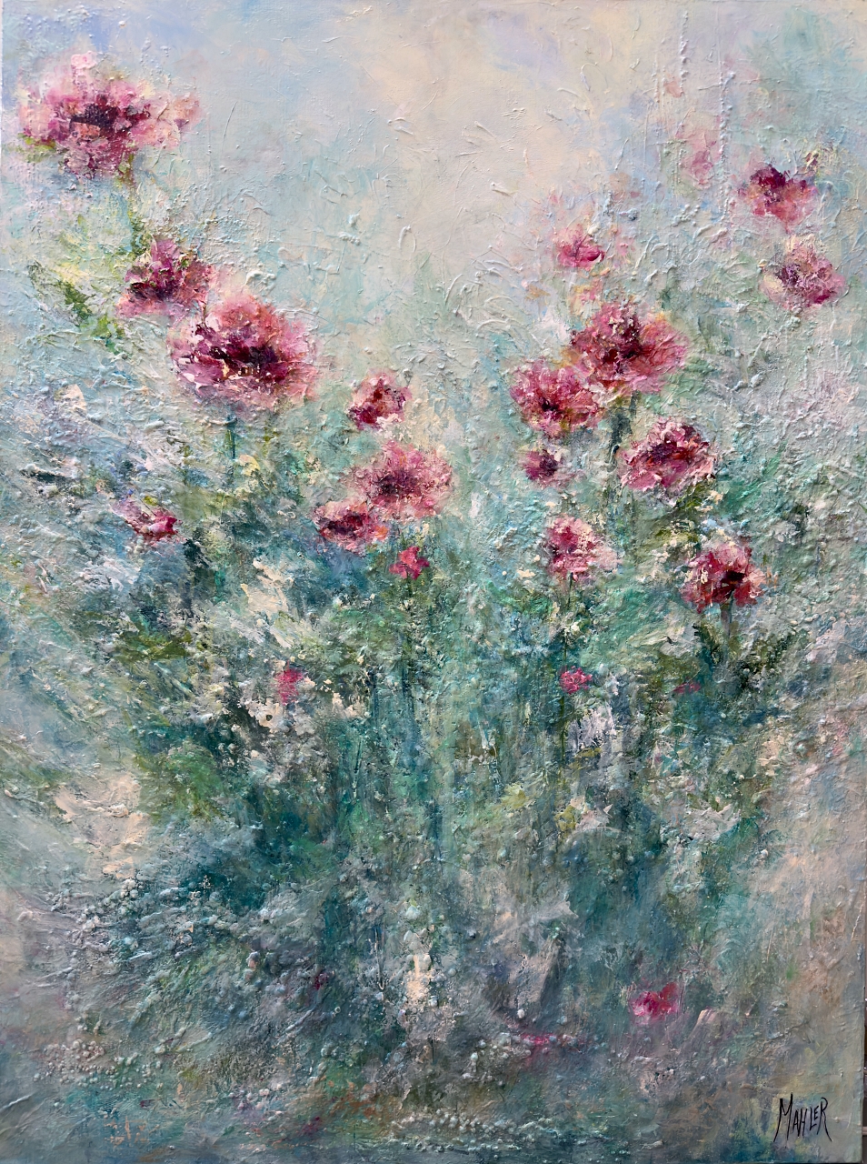 Monet’s Dance captures a fleeting moment of floral grace through textured layers and soft, impressionistic brushwork. Pink blooms emerge gently from a blend of blues and greens, their delicate forms shaped by thick, tactile strokes that invite closer viewing. The background shifts from deep, grounded hues to lighter, airy tones, creating a sense of lightness and quiet movement. This balance of texture and softness evokes a tranquil, natural rhythm, allowing the composition to breathe with effortless elegance. Painted on a museum quality canvas with 1.5″ deep stretcher bars. Ready to hang. No Frame needed.