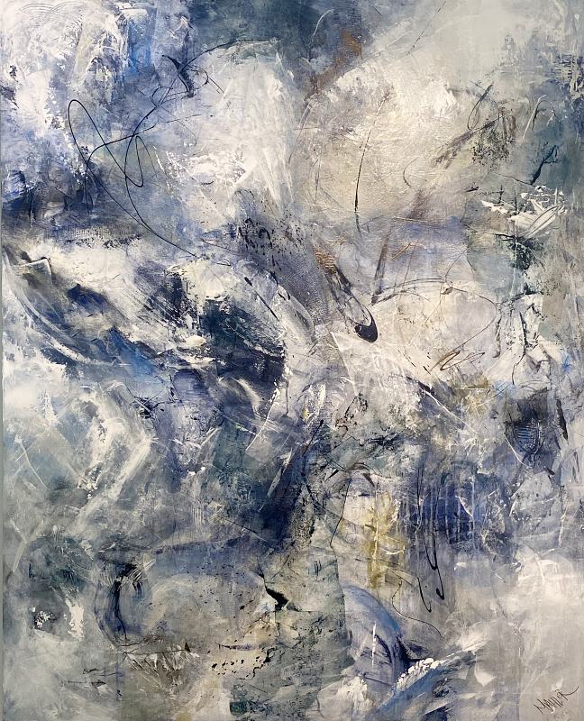Movement, blue, gray, and neutral tones make a statement in any room. Soft saturation of cream and white, along with complicated strokes of intentional brushstrokes, brings an interesting harmony to the composition.