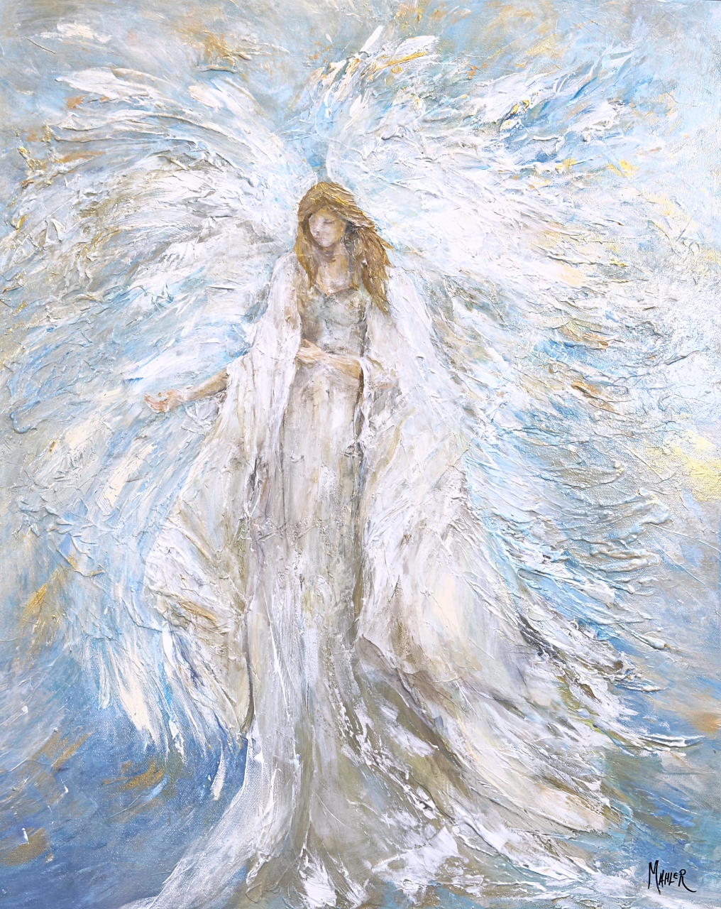 Wings of Light presents a serene figure cloaked in softly flowing fabrics that blend into broad, textured wings. The wings extend with delicate brushwork that suggests lightness and subtle movement, while the figure’s warm brown hair falls gently over one shoulder. Set against a background of cool blues and muted golds, the composition evokes a quiet, celestial presence. The piece balances texture and color to create an atmosphere of calm grace and gentle strength. 20×24